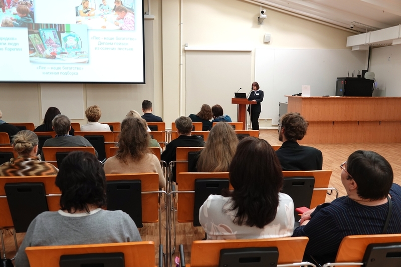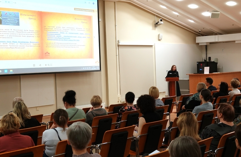 - Irina Šustrova, kansallisen ja kotiseutukirjallisuuden ja bibliografian osaston johtava kirjastonhoitaja, tutustutti kuulijat sähköisiin resursseihin Nimet Karjalan historiassa ja Karjalan kirjailijoiden sähköinen kirjasto.