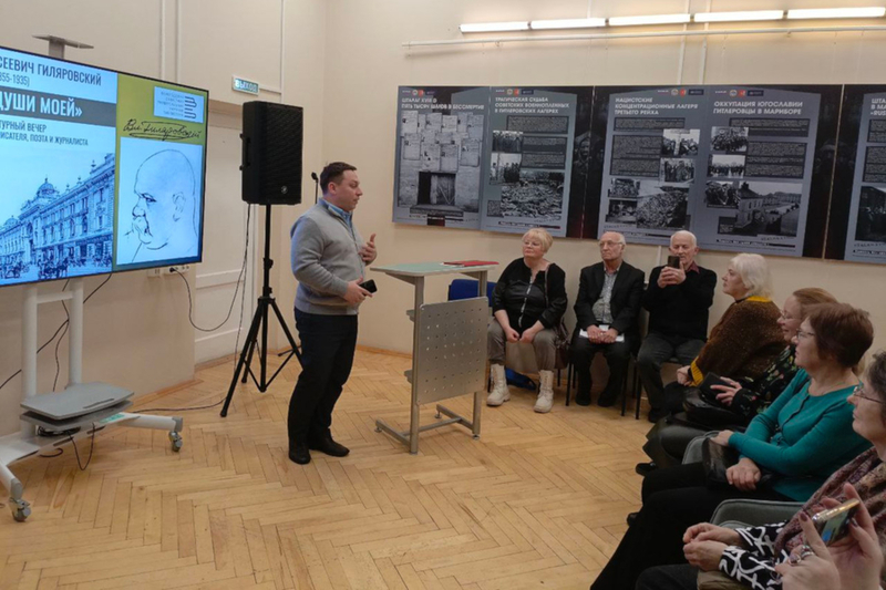 Yleisö tutustui Giljarovskiin myös runoilijana. Paikallinen radiotoimittaja Nikolai Korobov lausui Giljarovskin runoja.