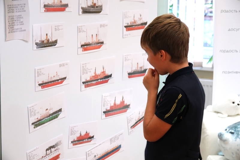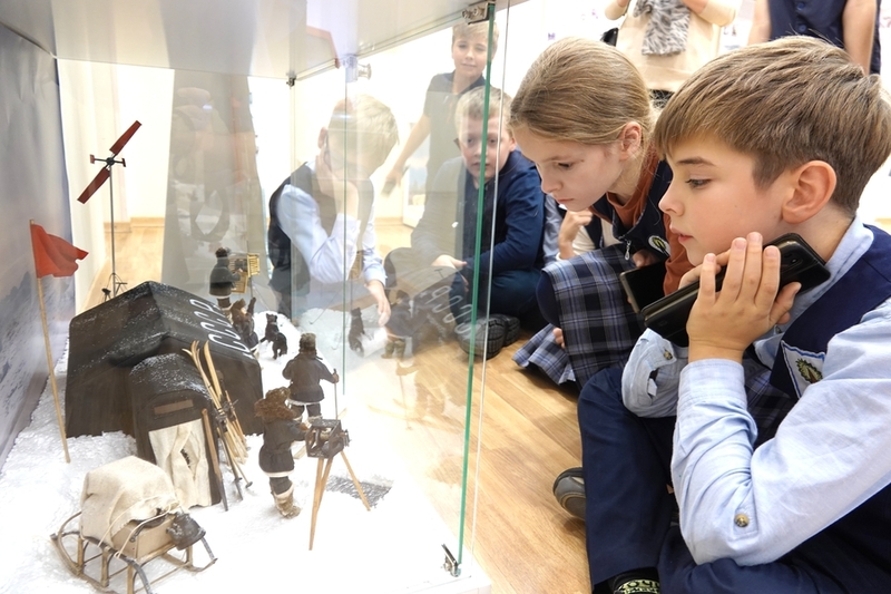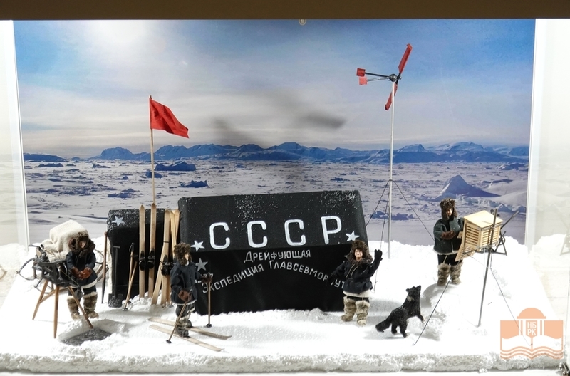 Näyttely jaettiin kahteen tietoalueeseen, joista alempi oli tarkoitettu lapsille ja ylempi aikuisille. Alempana olevat lasivitriinit olivat täynnä miniatyyrinukkeina tehtyjä pienoismalleja. Vitriinien aiheet: Arktiksen eläimet, poronhoitajien leiri, Severnyi poljus 1 - ajelehtivan tutkimusaseman pienoismalli sekä Papaninin retkikunnan jäsennukkeja, Arktitsheskij trilistnik -niminen (Arktinen apila) tukikohta ja rakennussetistä rakennettu Severnyi poljus - jäänkestävä ajelehtiva tutkimusasema. Aluelliseen komponenttiin kuului paperiartikkeleita ja I. Papaninin vierailun aikana vuonna 1938 Petroskoissa otettuja valokuvia sekä kokonainen vitriini, joka on omistettu Vladimir Voroninille - Karjalasta kotoisin olevalle Neuvostoliiton tunnetuimmalle jäänmurtajan kapteenille.