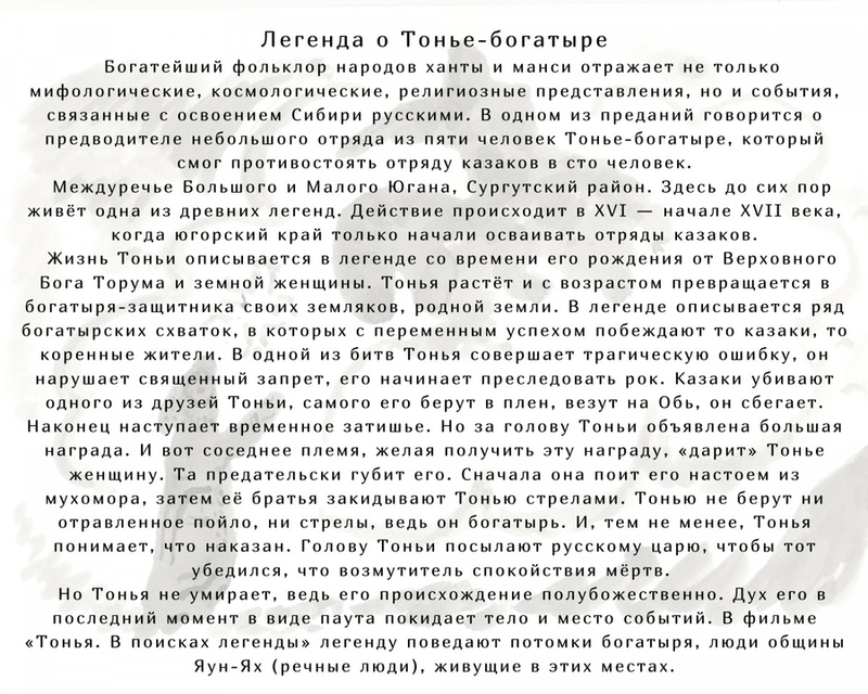 Teoksille on ominainen erityinen eeppinen ja ajallisesti kaukainen rakenne. Näyttelyn osana olevassa elokuvassa kansanrunousmateriaali ”herää eloon” kansanrunoutta säilyttävien Tonjan jälkeläisten kautta. Muinaisen Juganin maan ja sitä suojelevien sankarillisten esi-isien hahmoa täydentävät Raiševin taulukompositiot ja akverellimuotokuvat, jotka taiteilija loi ollessaan vuonna 1982 tutkimusretkellä Juganin joella.